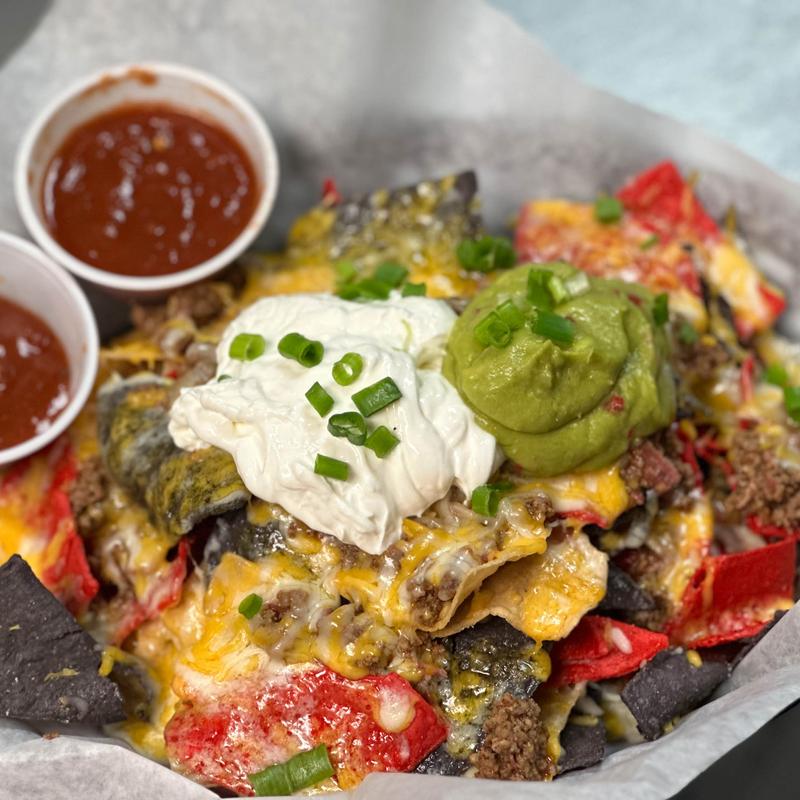 With brisket, hummus, cheese, quacamole, sour cream, and jalapeños