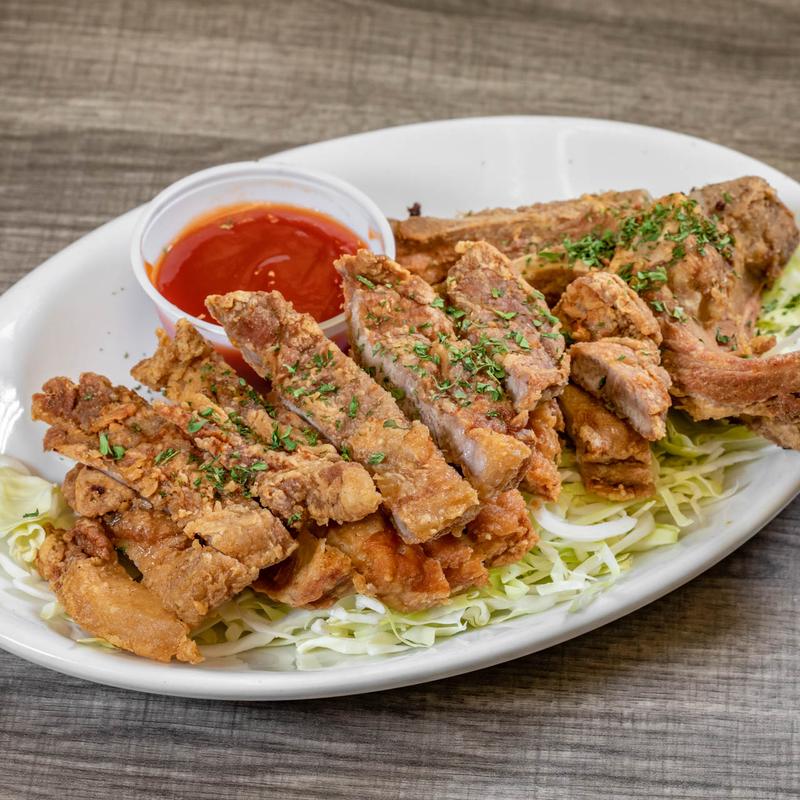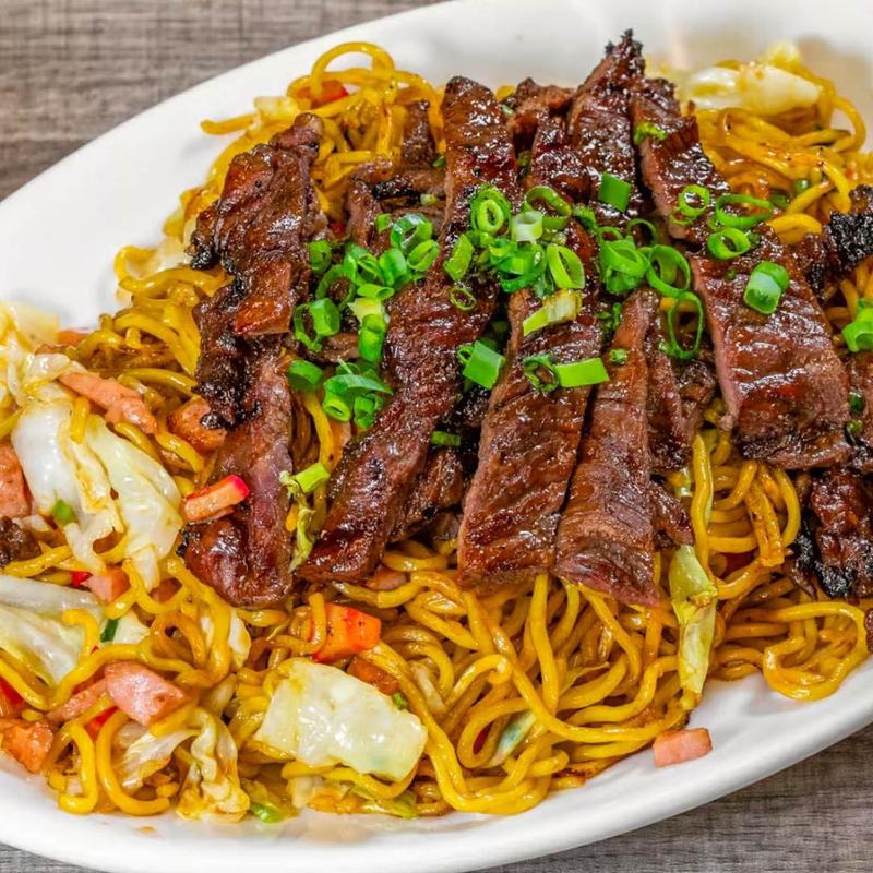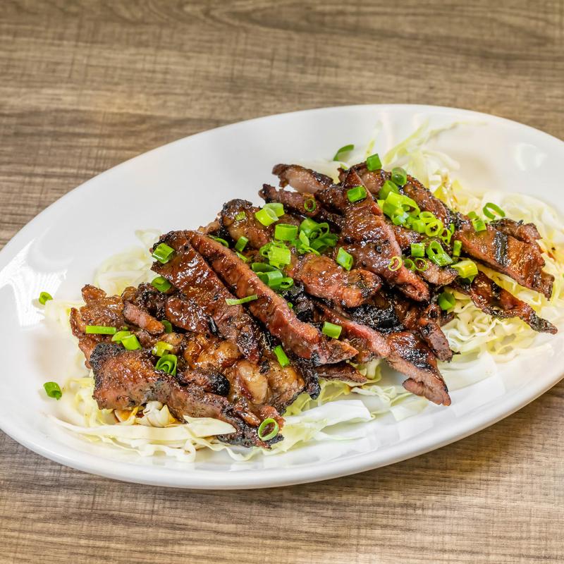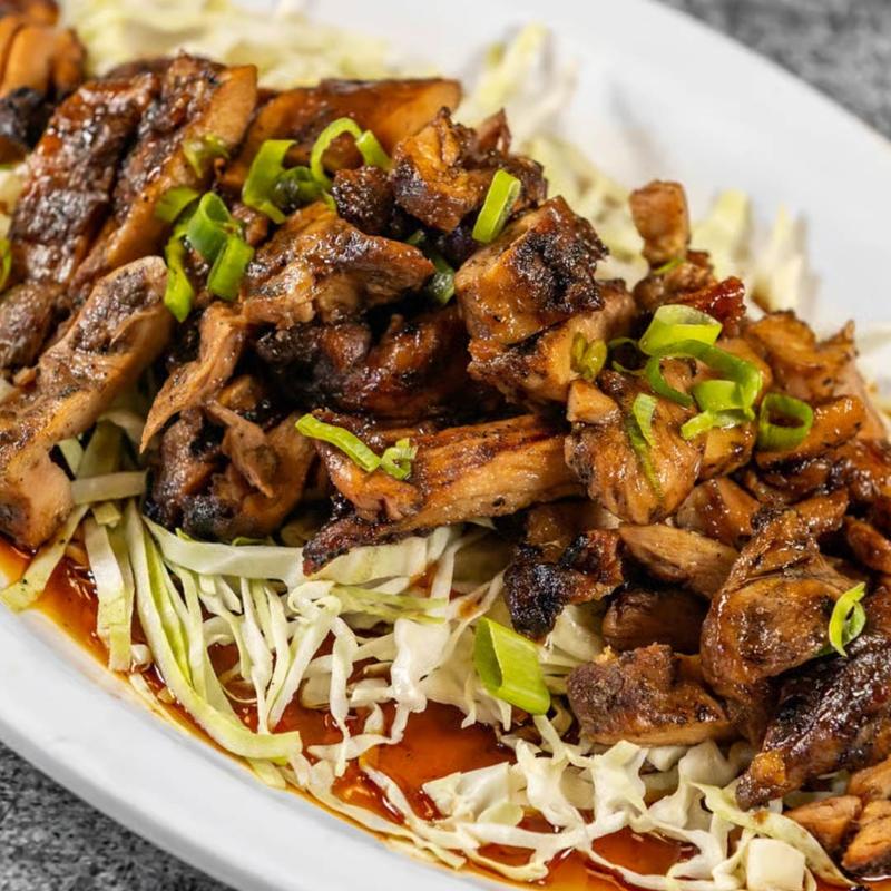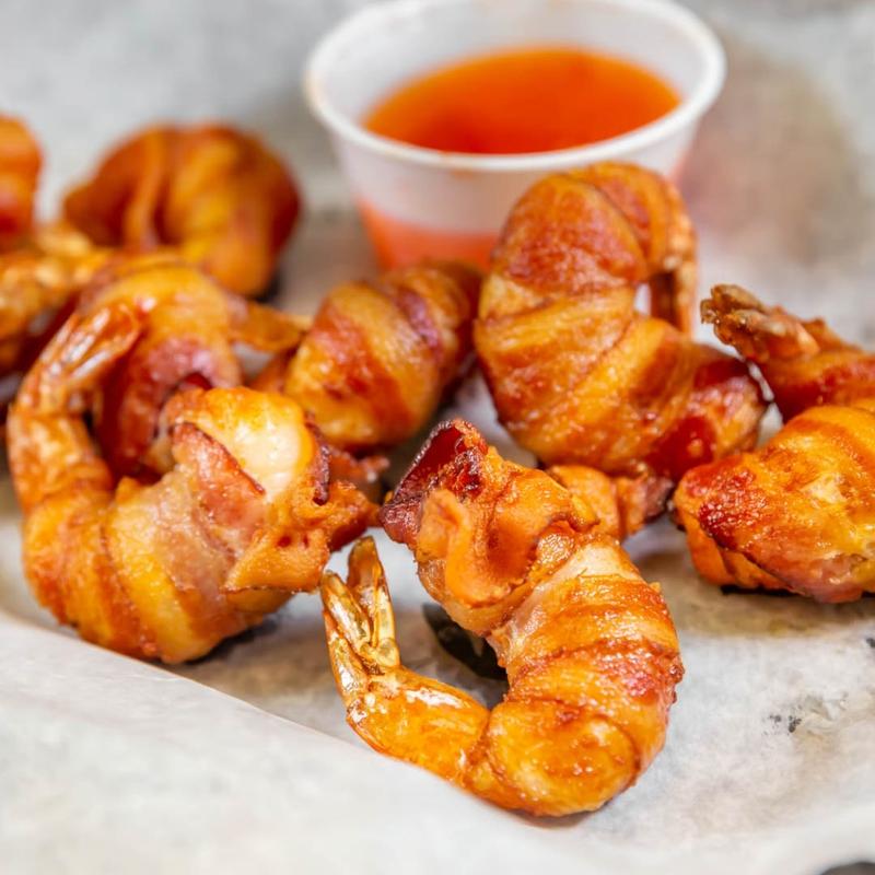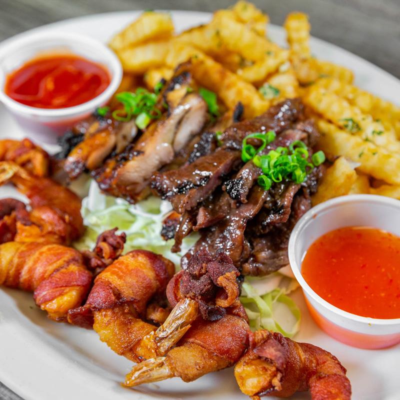 Boneless kalbi beef, huli-huli chicken, bacon-wrapped shrimp
